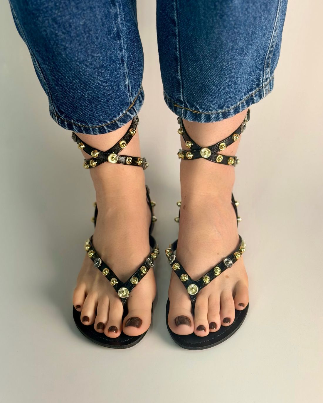 DUDA PRETA - FLAT RASTEIRA DE DEDO COM ESFERAS E MEDALHAS PRETA