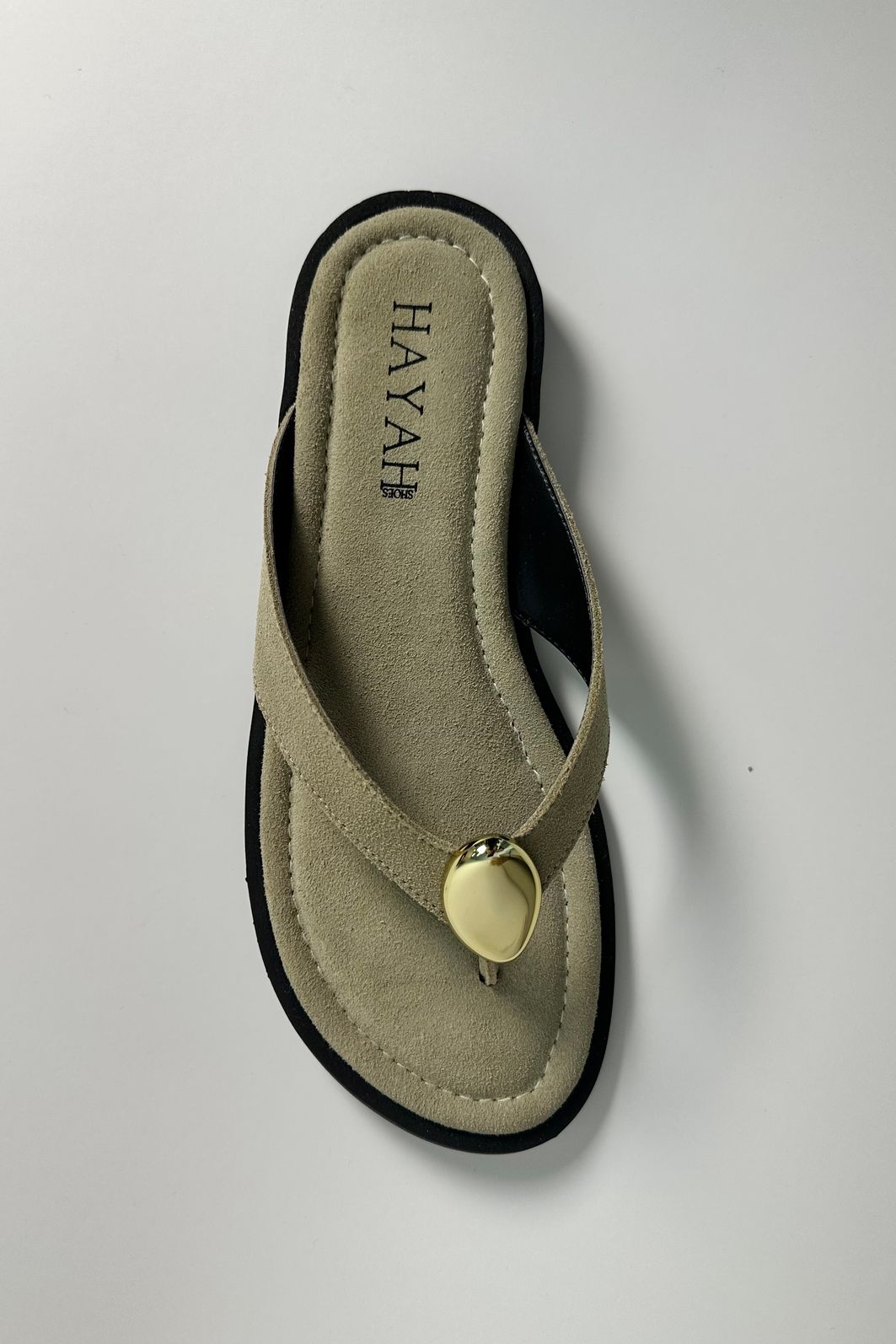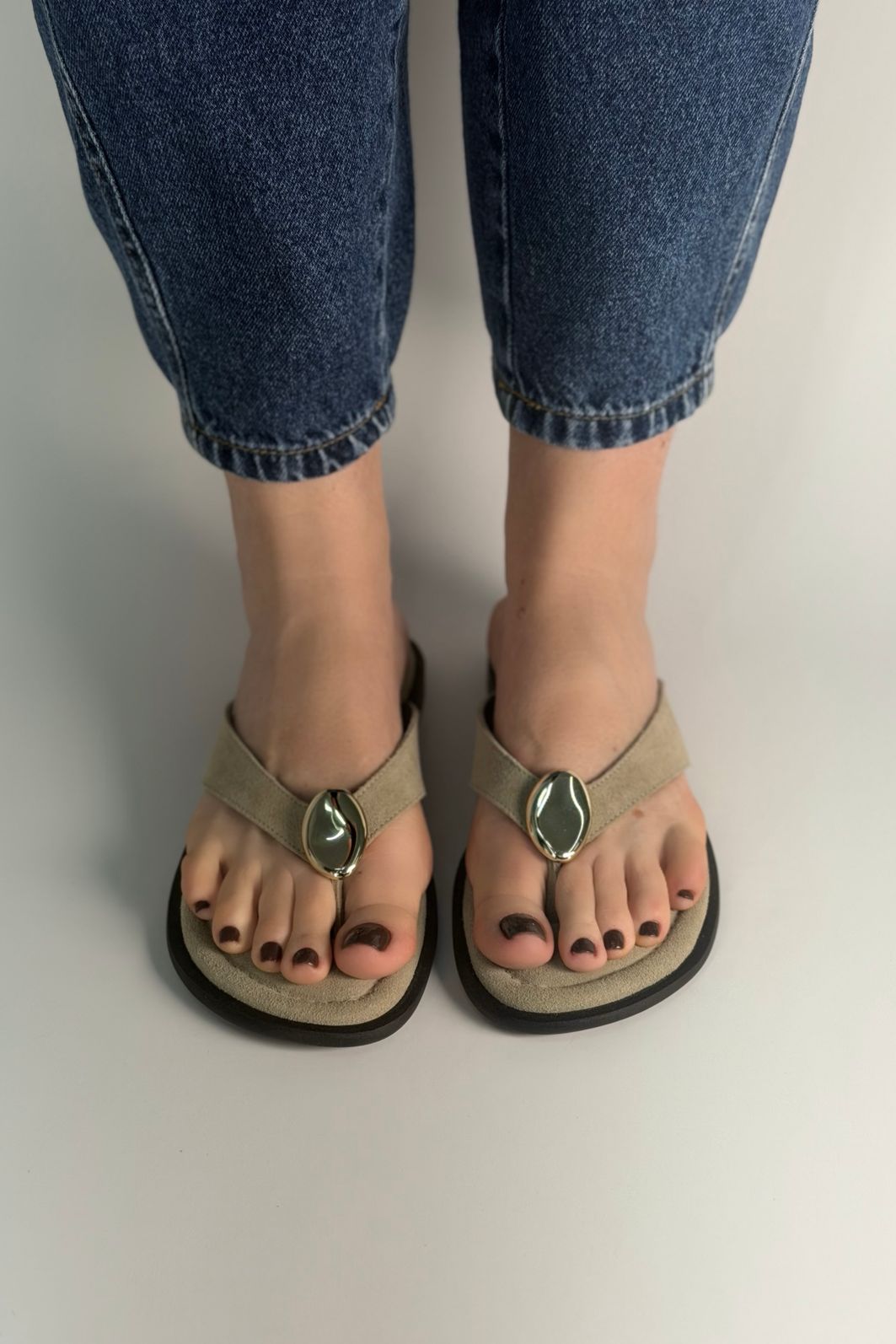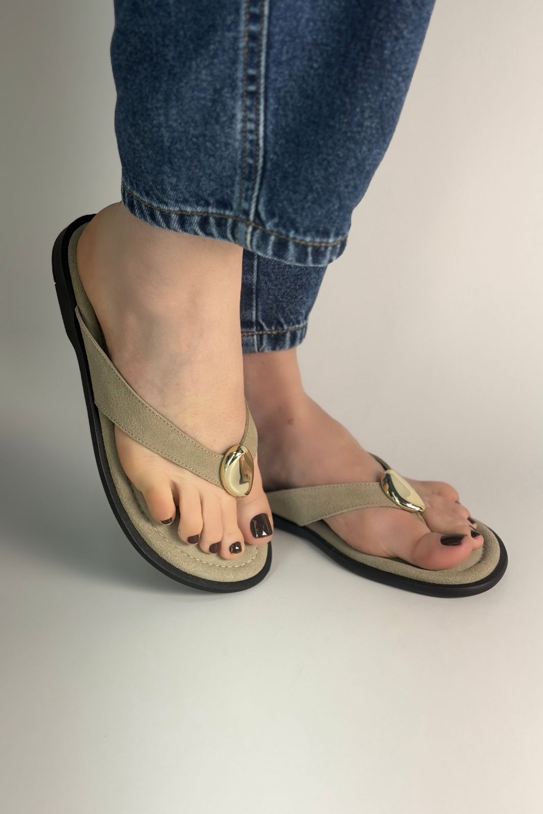 O Chinelo SOL é produzido em camurça sintética premium, com aplicação metálica dourada no centro da tira do cabedal, garantindo um visual minimalista e sofisticado.