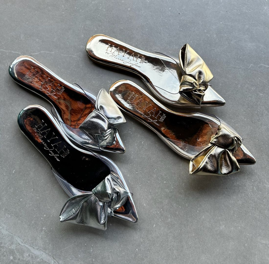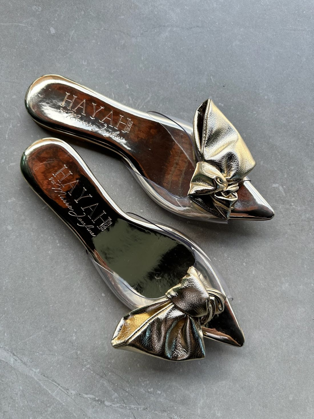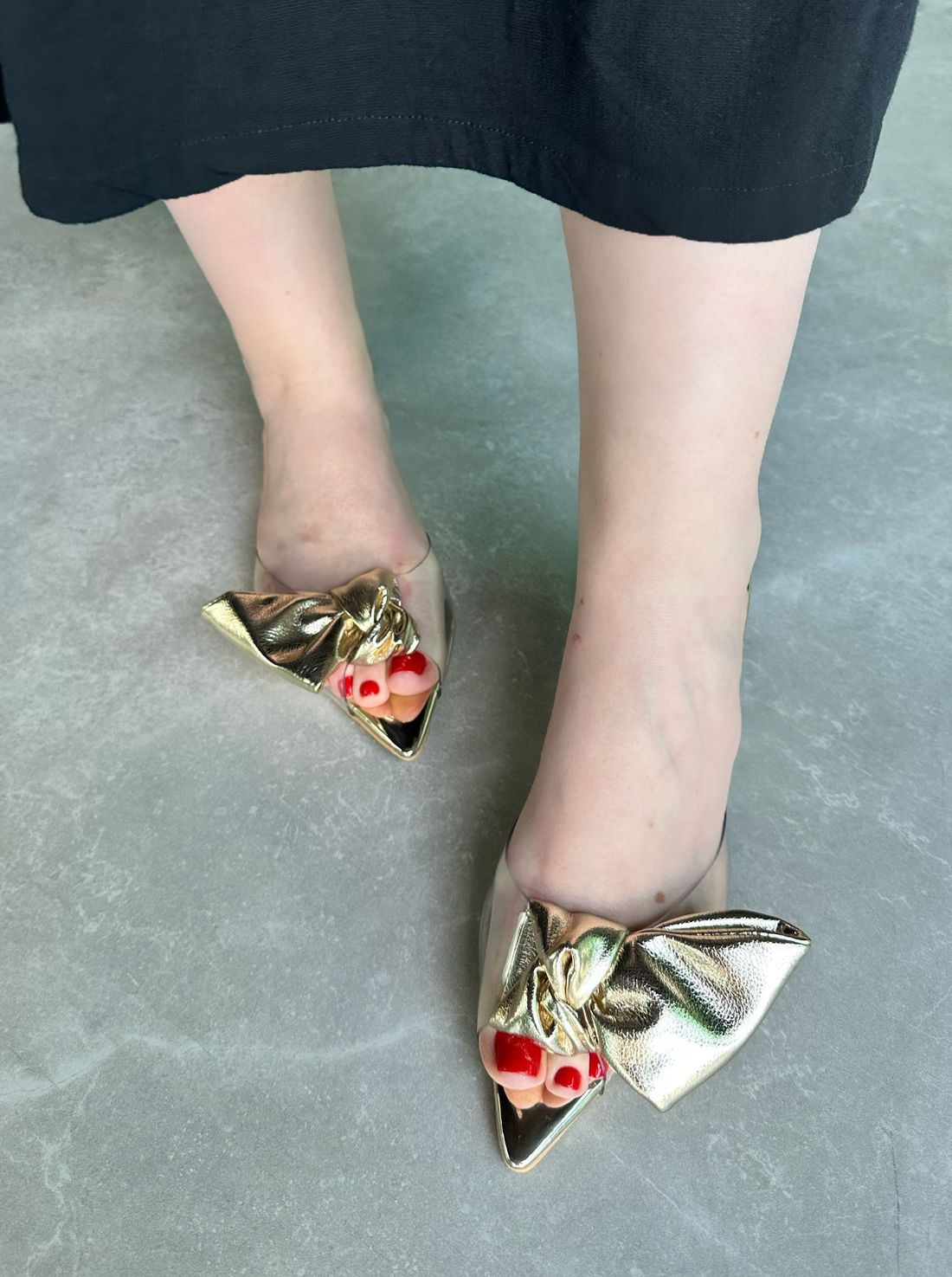 Nossa Mule TÁSSIA Dourada é linda, graciosa e muito confortável. Possui exuberante laço no cabedal em material sintético. Um verdadeiro charme para os seus pés!