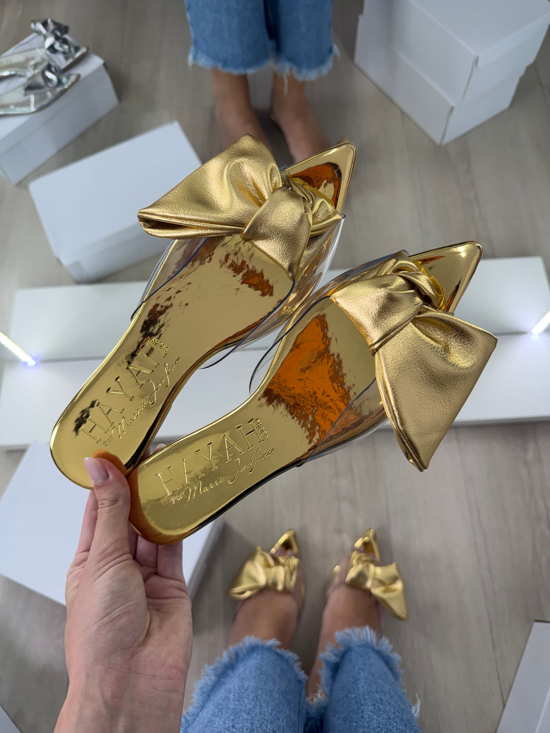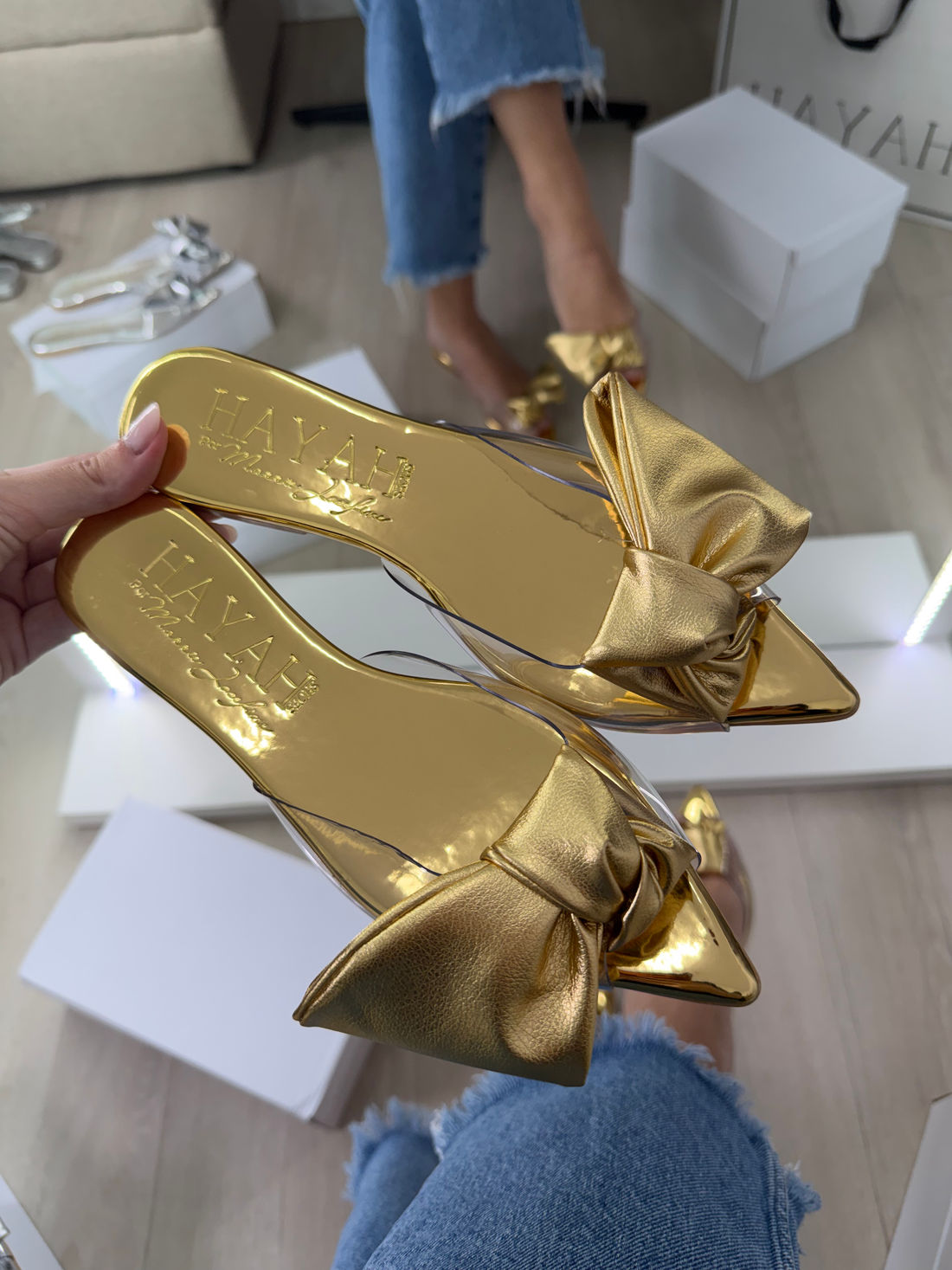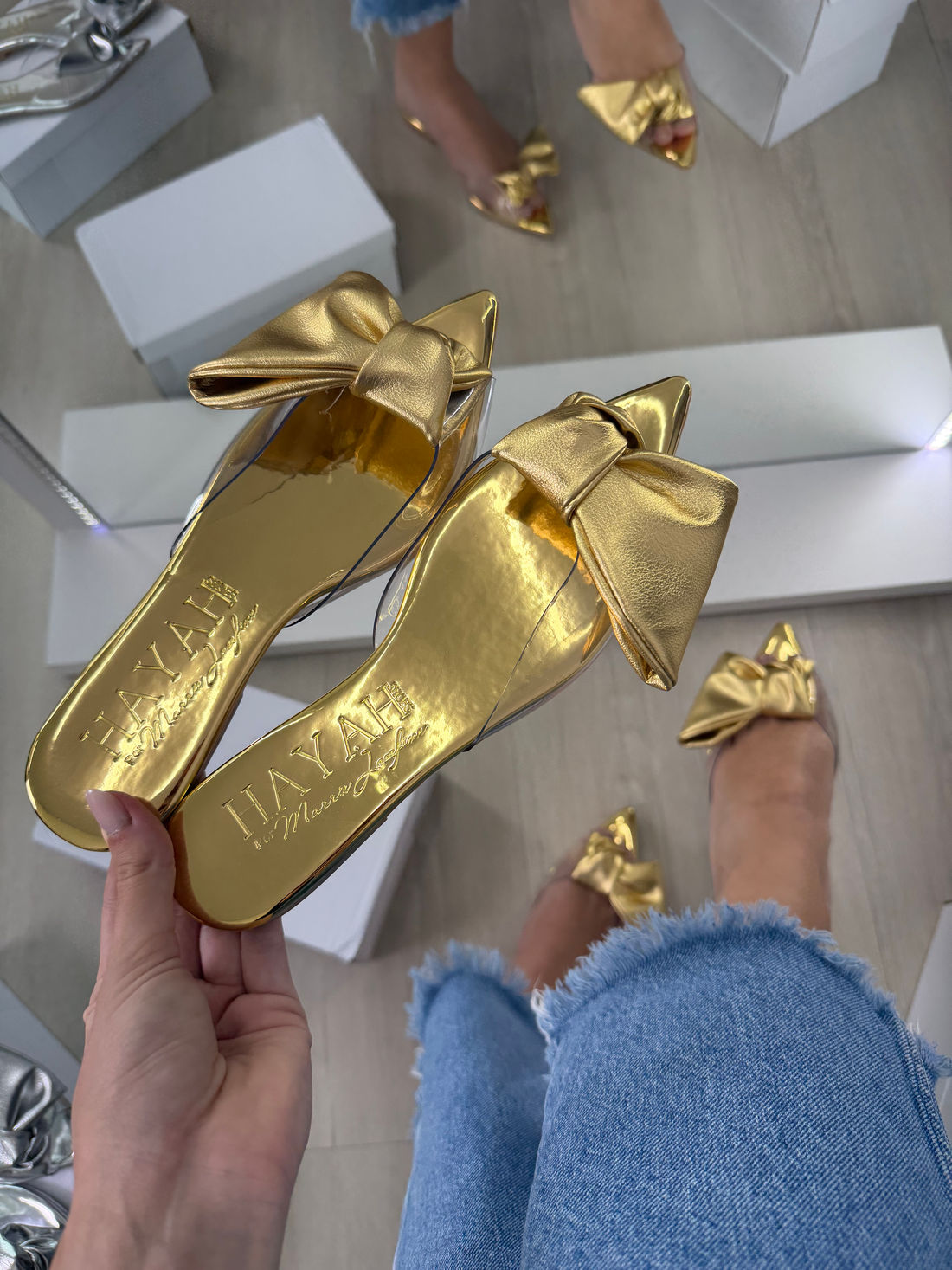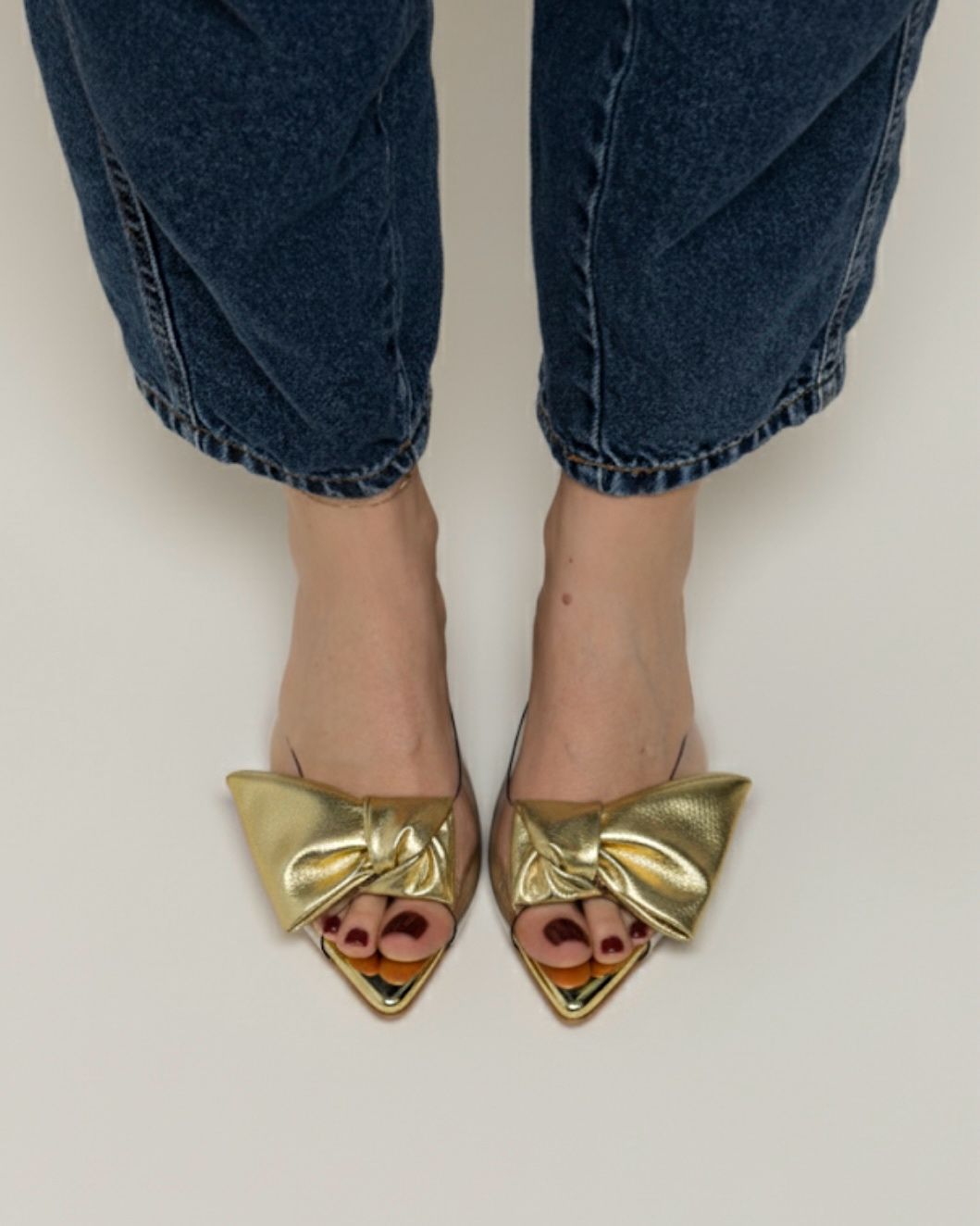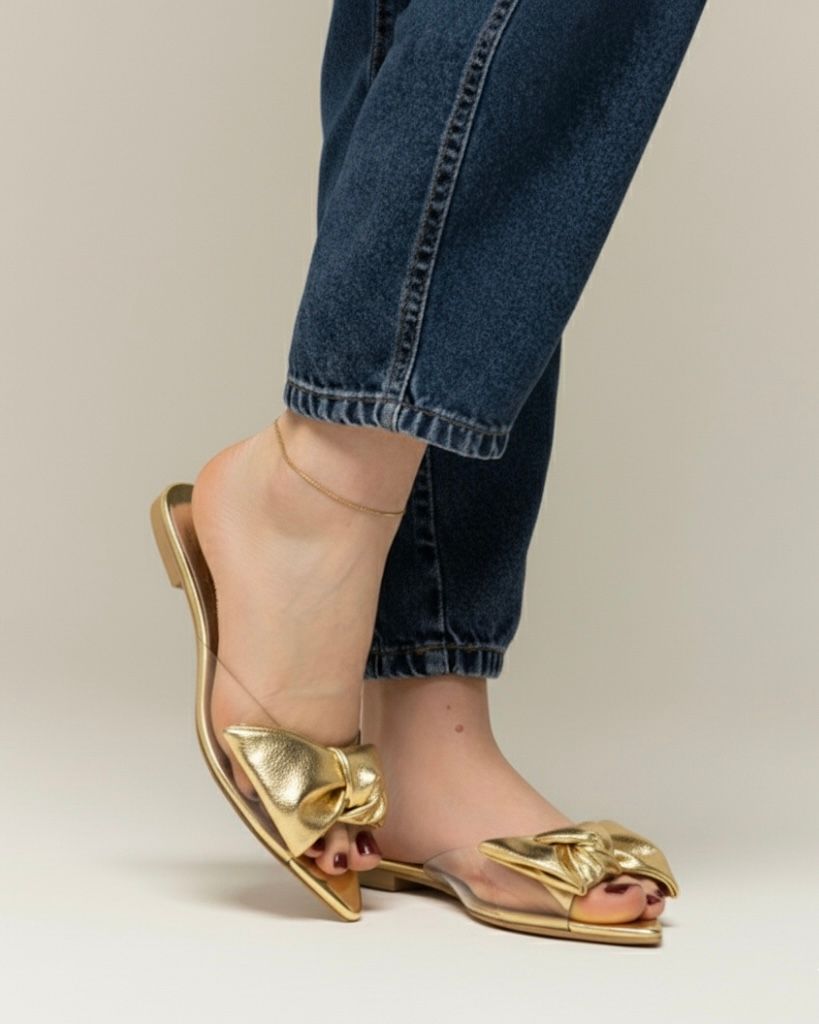 A Flat Tássia Dourada Hayah Shoes apresenta um laço exuberante e marcante no cabedal, conferindo um toque de glamour instantâneo. O acabamento metalizado dourado, adiciona um brilho chique e versátil, perfeito para diversas ocasiões.
