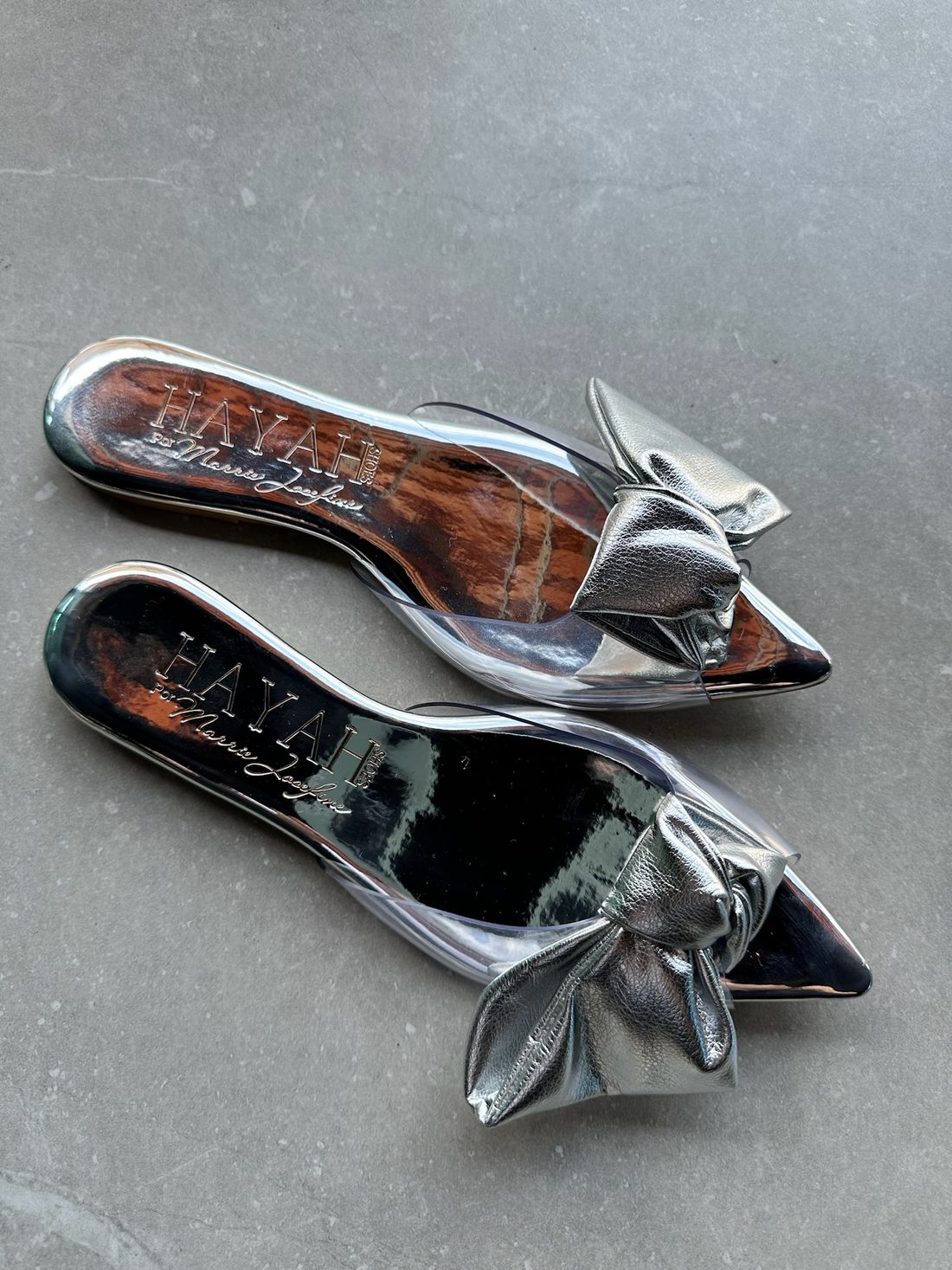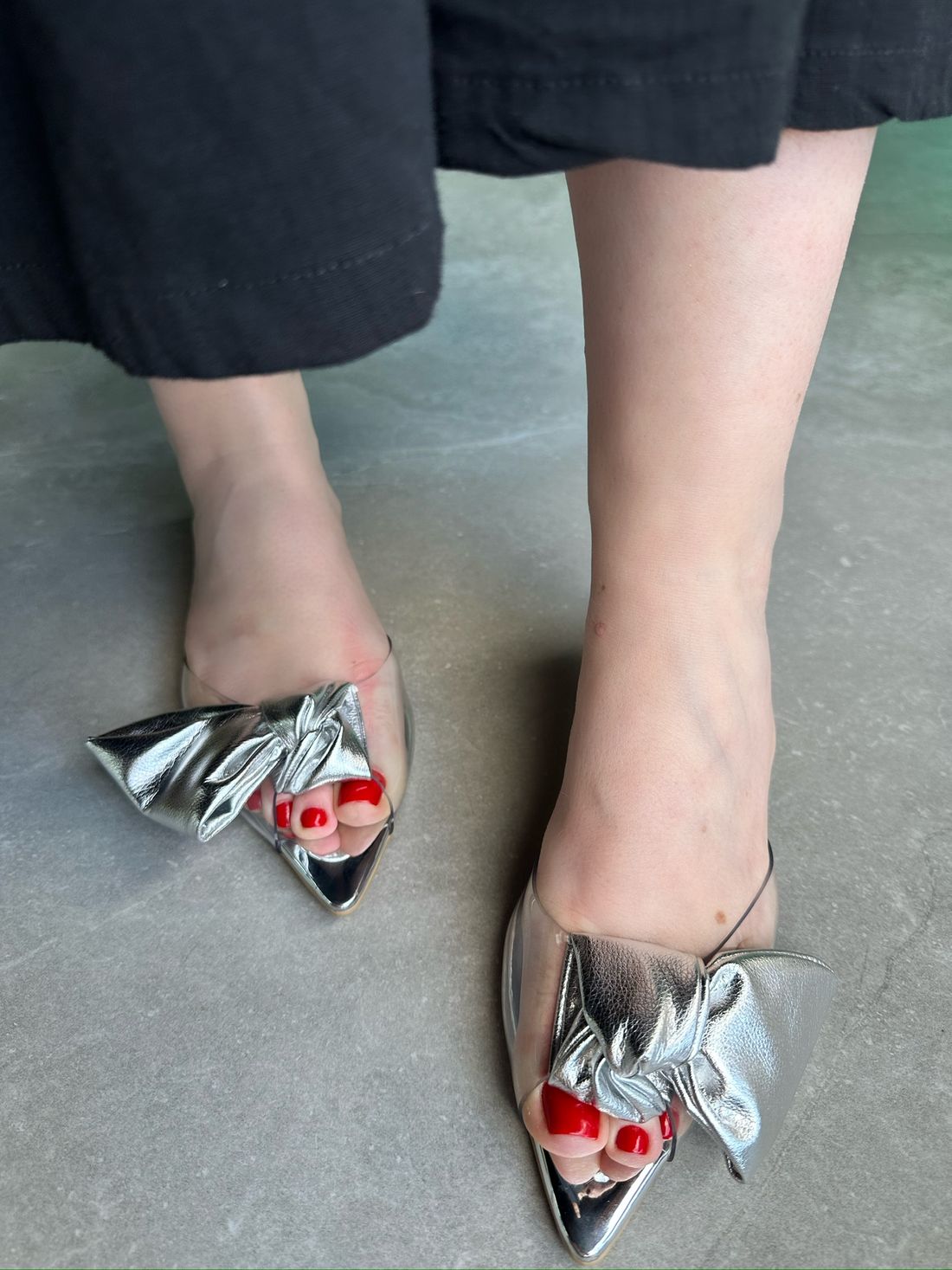 Nossa Mule TÁSSIA Prata é linda, graciosa e muito confortável. Possui exuberante laço no cabedal em material sintético. Um verdadeiro charme para os seus pés!